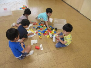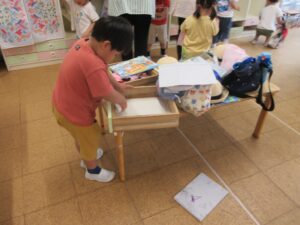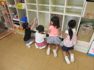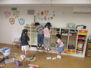 あと、2日で夏休みになります。夏休み前に、お部屋をきれいにしておくので、今日と明日はみんなで大掃除です。おもちゃをきれいに拭いたり、ロッカーをきれいにしたり、引き出しをピカピカにしたりして、どのクラスでも一生懸命働いていました。幼稚園で大そうじをしたので、おうちでも「おもちゃをきれいにふかなくちゃ」と張り切っていた子がいたそうです。