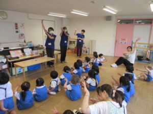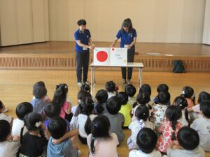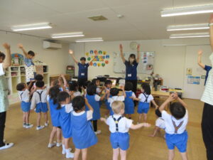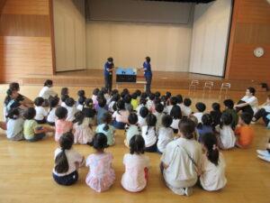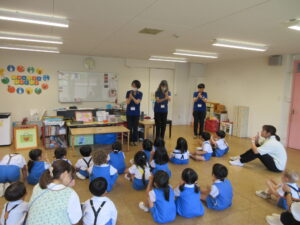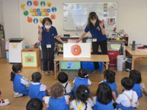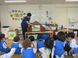 今年度も、ひばりが丘図書館の皆様におこしいただき『出前おはなし会』を行いました。年少さんははと1組に集まって、年中・年長さんはホールに集まって、手遊びや絵本の読み聞かせ、紙しばいを楽しみました。