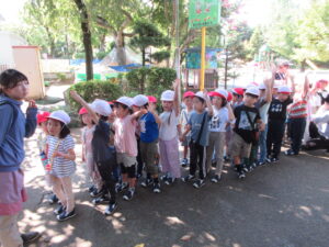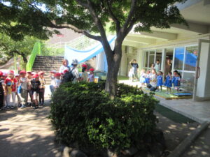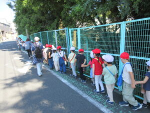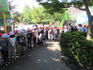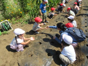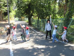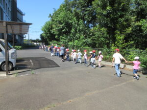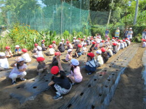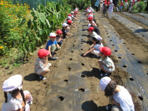 今日は、年長さんと年中さんがダイコンの種まきに出かけました。2学期が始まってもまだまだ猛暑日が続いていますので、今日は、特別に、水筒を持参して歩いて行きました。出る前に年少さんが「いってらっしゃい。」「よろしくお願いします。」って見送ってくれました。出かける直前、畑に着いてから、帰る時も畑を出る直前、幼稚園に着いてから、と水分を補給しながら活動しました。