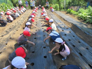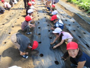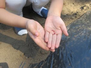 畑に準備されたマルチの穴一つに3粒ずつまいていきます。人差し指で3つの穴を空けて、一つずつ入れたら軽く土をかぶせておしまいです。一人で2個の穴を担当したので、6個の種をまきました。小さな小さな一粒があんな立派なダイコンになるなんて、植物の力に感動してしまいます。