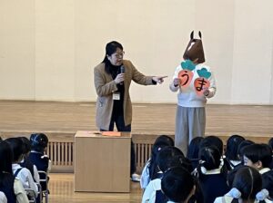 1月8日、3学期始まりの日。朝一番に正門前に並んでいる子ども達。何だかウキウキしているようでした。久しぶりにみんなに会えるのはうれしいですね。今年の冬休みも大きな怪我や事故の報告はなく、元気な笑顔がもどってきました。お部屋で遊んだあと、10時過ぎに、全員がホールに集まって始業式を行いました。最初に、元気いっぱいに園歌を歌いました。みんなで「明けましておめでとうございます。今年もよろしくお願いします。」のごあいさつをしました。園長からは、冬休みの振り返り、「お手伝いできたかな?」を聞きました。おそうじ、おせんたく、お料理、お茶わん洗いなど、それぞれ手をあげてもらいましたが、やったよ!という子がたくさんいました。今年はうまどし。おうまさんに扮した職員に手伝ってもらって、最後は「う」う~んと元気に仲良く遊んでね。「ま」まんまる笑顔ですごしてね。すると、何事も「うまくいくよ~」のお話をさせてもらいました。