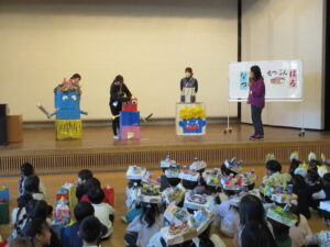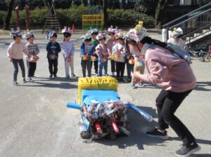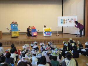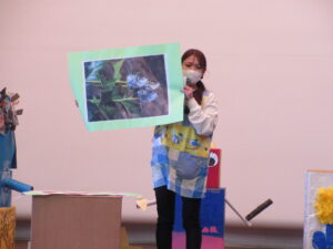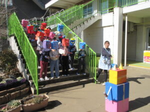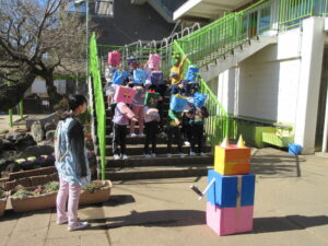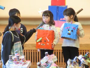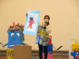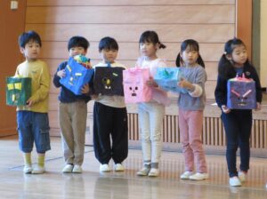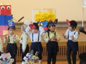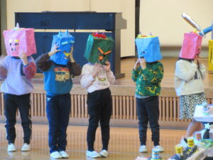 最後に各学年のオニのお面や被り物の説明です。どうやって作ったか、どんなところを工夫したかなど、年長さんは子どもが発表しました。