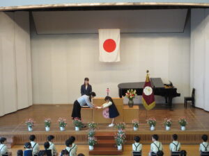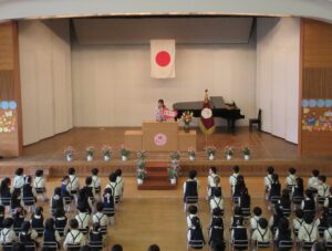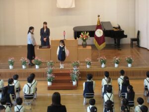 厳かな雰囲気の中、一人で立って歩いて、ステージの上でお返事をして修了証書をいただくというのは、大人でも緊張する時間です。どの子も姿勢よく歩み、立派に証書を受け取ってくれたことに感激しました。背筋が伸びて、気を付けが上手なのはリトミックの賜物かもしれません。証書を受け取ったら、おうちの方が待っているところまでまっすぐ歩いて行き、証書を渡します。おうちの方に一言きちんとお礼を言うように指導してきましたが、どうだったでしょうか?(園長は、子どもの方を向いているので、おうちの方との様子は全く見られません。残念・・・。)