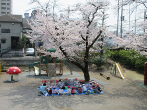 3月30日、今年度もあと一日になりました。桜が満開です。外で食べたいなぁ、という子ども達の声に応えて、今日は外でお昼を食べることにしました。園庭に、大きなブルーシートを敷いてみんなで食べました。外で食べるお弁当の味は、格別です。みんなで輪になって、おしゃべるしながらのんびりといただきましたよ。食事のあとは、花びらを集めたり、虫さがしをしたりして遊びました。